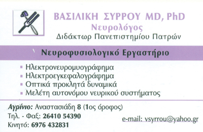 ΣΥΡΡΟΥ ΒΑΣΙΛΙΚΗ: Νευρολόγος, Διεύθ.: Αναστασιάδη 8, 1ος όροφος, Αγρίνιο, τηλ. 2641054390
